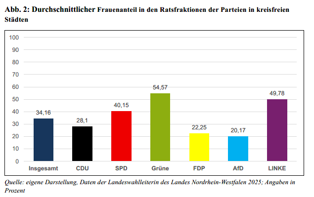 Eine entscheidende Rolle für den Frauenanteil spielt dabei die parteipolitische Zusammensetzung der Räte, der sich in den Ratsfraktionen der kreisfreien Städte gut nachverfolgen lässt (Abb. 2). Die Grünen setzen seit Jahren konsequent auf eine innerparteiliche Frauenquote und erzielen auch 2025 mit knapp 55 Prozent Frauen in ihren Ratsfraktionen das beste Ergebnis. Dahinter folgen die LINKE mit 49,78 Prozent und die SPD mit 40,15 Prozent – beide verfügen ebenfalls über parteiinterne Geschlechter- bzw. Frauenquoten. Die CDU liegt mit 28,1 Prozent auf Platz vier. Deutlich abgeschlagen sind FDP (22,25%) und AfD (20,17%), die sich weiterhin gegen eine parteiinterne Frauenquote aussprechen.