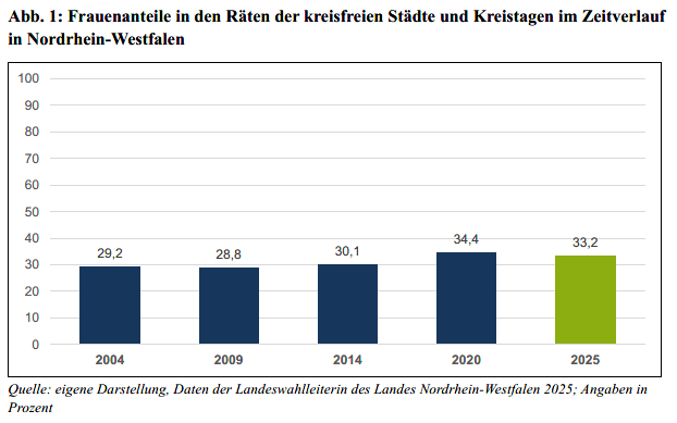 Ernüchternde Bilanz der NRW-Kommunalwahl im September 2025: Trotz anhaltender Gleichstellungs- und Paritätsdebatten in Bund und Ländern ist der Frauenanteil in den kommunalen Vertretungen NRWs auf 33,2 Prozent gesunken. Auch wenn in Bund und Ländern immer wieder intensiv über das Thema Parität diskutiert wird, zeigt sich, dass ohne eine Wahlrechtsreform eine paritätische Besetzung auf kommunaler Ebene in den nächsten Jahren nicht erreicht werden kann. Vielmehr lassen die aktuellen politischen Entwicklungen einen weiteren Rückgang befürchten.